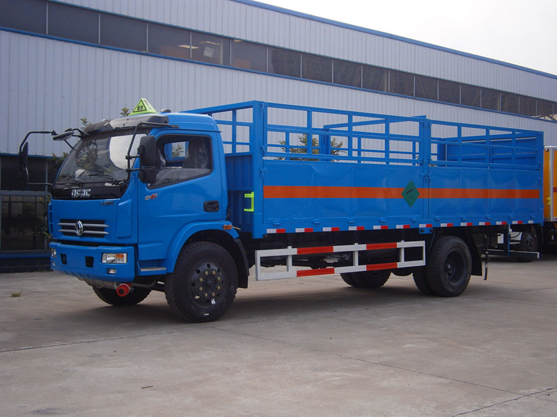 仓栅厢(下层栏板,上层仓栅),前部安装灭火器,排气管前置尾端安装排气火花熄灭器,车架安装导静电橡胶拖地带,驾驶室安装危险三角标志灯,车身侧面及后部粘贴橙色反光标识,3个易燃气体菱形标示。矩形危险品牌1个。