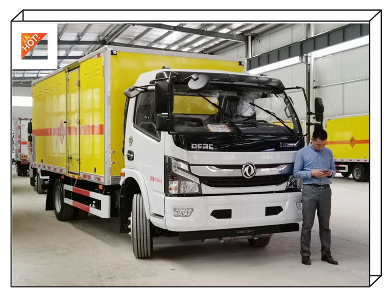 东风多利卡5.1米爆破器材运输车专用厢体为金属整体骨架式,由顶板、侧板、前板、底板、后门总成、门框、副车架几大部分组成,各板块夹层填充阻燃隔热材料。厢体外形安装铝合金型材立柱、护板及不锈钢包角等装饰品;厢内设置一定数量的卧环,以便于固定货物;安装烟雾探测器、防盗感应器、导静电装置和警示装置。驾驶室顶部危险品三角灯、危险品警示牌、灭火器、三角楔、反光背心等。